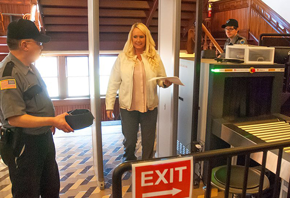 Phoenix Protective security officer Mike Stout and Kyle McQueen watch as Stephanie Headrick passes through a metal detector at the Jefferson County Courthouse.
